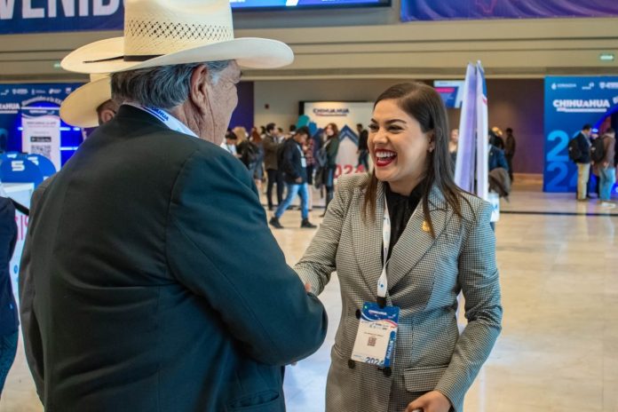 Meoqui.- “Trabajamos de la mano con la gobernadora Maru Campos para enfrentar la problemática del agua”, destacó la alcaldesa de Meoqui, la Arq. Miriam Soto, tras asistir a la Expo Aneas 2024, el evento más importante del agua en América Latina, mismo que estuvo encabezado por la Gobernadora Maru Campos, el presidente de la Asociación Nacional de Entidades de Agua y Saneamiento (ANEAS), José Lara Lonael, el alcalde de Chihuahua, Marco Bonilla y Mario Mata, Director Ejecutivo de la JCAS.