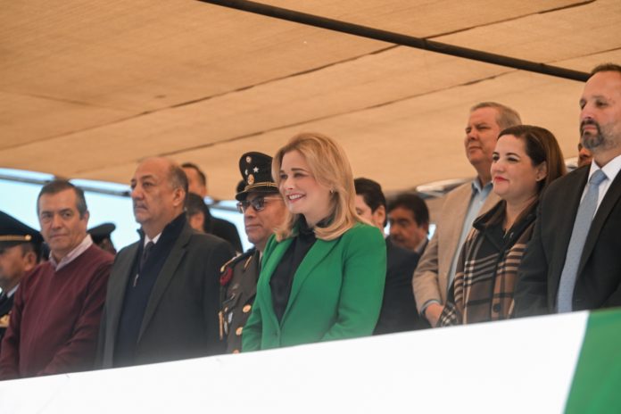 Maru Campos estuvo acompañada por la cónsul de Canadá, Annabelle Larouche, los titulares de las secretarías de Educación y Deporte y de la General de Gobierno, Francisco Gutiérrez Dávila y Santiago de la Peña, así como por la magistrada presidenta del Tribunal Superior de Justicia, Myriam Hernández y el alcalde de Chihuahua, Marco Bonilla, entre otras autoridades militares.