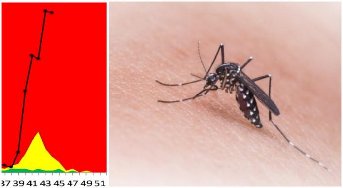 La gráfica sobre el canal endémico de dengue en la entidad chihuahuense se encuentra muy por encima de la zona de alarma, pero en la última semana mostró signos de repunte.