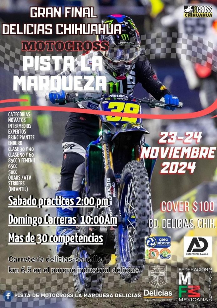 Delicias.- El Gobierno Municipal de Delicias invita a la ciudadanía a disfrutar de la gran final de Motocross que se llevará a cabo este fin de semana en la pista La Marqueza, ubicada en el kilómetro 6.5 de la carretera Delicias-Saucillo, dentro del Parque Industrial Delicias. Este emocionante evento reunirá a pilotos locales, estatales y nacionales, dejando una importante derrama económica en la ciudad.