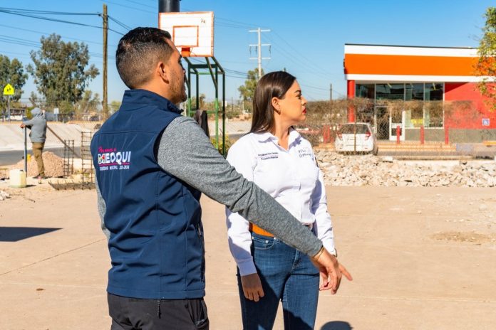 Meoqui.- La alcaldesa de Meoqui, Arq. Miriam Soto, supervisó los trabajos de la rehabilitación exterior del Gimnasio Municipal, proyecto que incluye la construcción de una cancha de básquetbol techada con iluminación, dos medias canchas y la instalación de aparatos para hacer ejercicio.