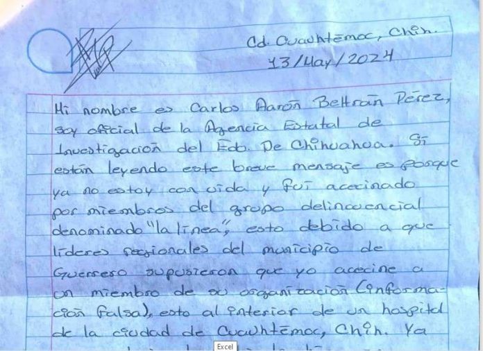 Chihuahua.- Carlos Aarón Beltrán Pérez, policía de la fiscalía del Estado ejecutado a balazos la noche del pasado domingo en ciudad Cuauhtémoc, había sido amenazado de muerte y dejó una carta en la que da a conocer nombres de los presuntos responsables, además, señala de corruptos a algunos jefes de la Agencia Estatal de Investigación.