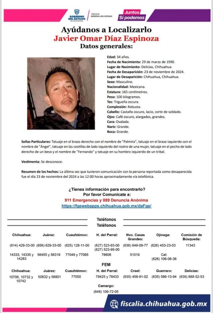 Javier Omar Díaz Espinoza es originario de Delicias, Chihuahua, y cuenta con varias señas particulares que podrían ayudar a su identificación. Entre ellas se incluyen:
