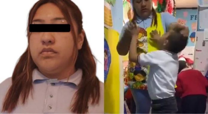 En las imágenes, la maestra aparece agrediendo físicamente a varios niños, incluyendo un menor con discapacidad, al jalarle el cabello y administrarle un medicamento de manera brusca.