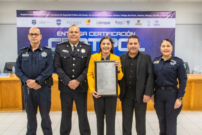 Meoqui.- El municipio de Meoqui se sumó a los 6 municipios con la certificación CERTIPOL, siendo sede del evento en el que además, se entregaron las certificaciones a las direcciones de Seguridad Pública de los municipios de Jiménez, Hidalgo del Parral y Saucillo, esto gracias a una importante colaboración entre el Gobierno Municipal, FICOSEC, el Gobierno del Estado, a través de la Secretaría de Seguridad Pública del Estado y el Insyde.