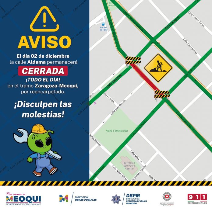 Gobierno Municipal de Meoqui informa que hoy lunes 2 de diciembre se encontrará cerrada durante todo el día la calle Aldama en el tramo Zaragoza – Pedro Meoqui, debido a los trabajos de reencarpetado.