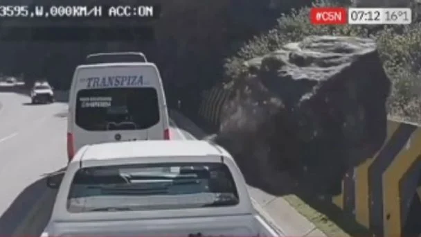 En el video de sólo seis segundos, se observa como la roca impacta en la parte donde se encontraban los pasajeros y voltea el automóvil, dejándolo destruido.