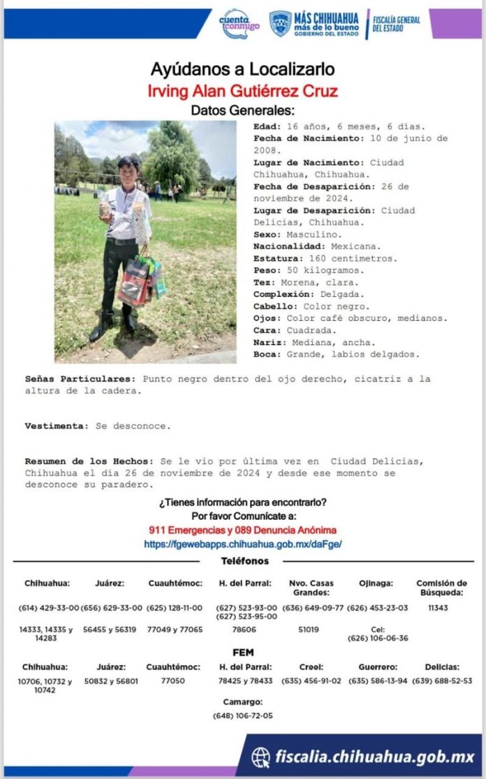 Delicias.- Ayúdanos a encontrar a Irving Alan Gutiérrez Cruz, un adolescente de 16 años que desapareció el pasado 26 de noviembre.