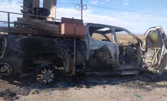 La policía, soldados y Guardia Nacional montaron un operativo y hoy se da a conocer que fueron localizadas al menos dos unidades calcinadas, una de las cuales tiene instalada en la caja una base para empotrar un fusil, así como una placa protectora de acero para el tirador.