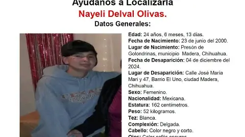 Cindy Delval Olivas cuenta con 27 años de edad y quien el mismo 4 de diciembre fue reportada como desaparecida, mide 150 centímetros, pesa 62 kilogramos, es de tez blanca y complexión delgada, al momento de su desaparición, portaba una blusa de color rosa con corazón, un pantalón de color verde tipo soldado y unos tenis.