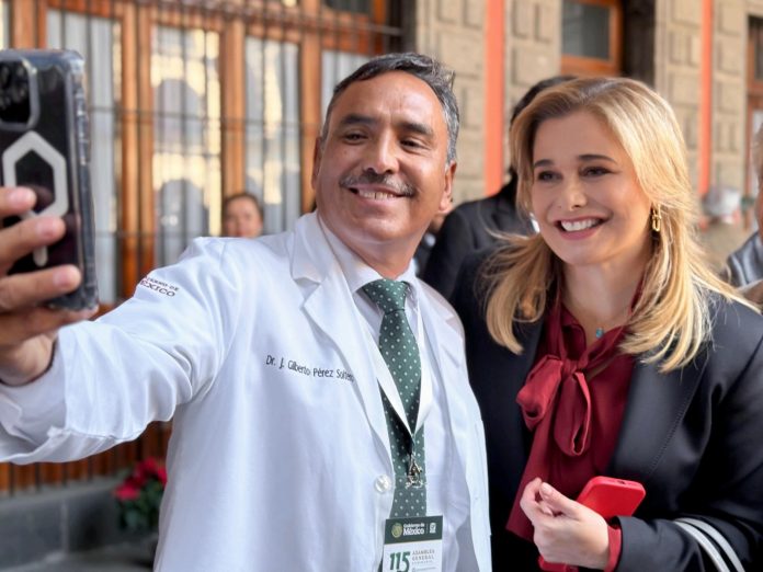 Chihuahua.- La gobernadora Maru Campos acudió como invitada especial a la 115 Asamblea General Ordinaria del Instituto Mexicano del Seguro Social (IMSS), celebrada en el Patio Central de Palacio Nacional, en la Ciudad de México.
