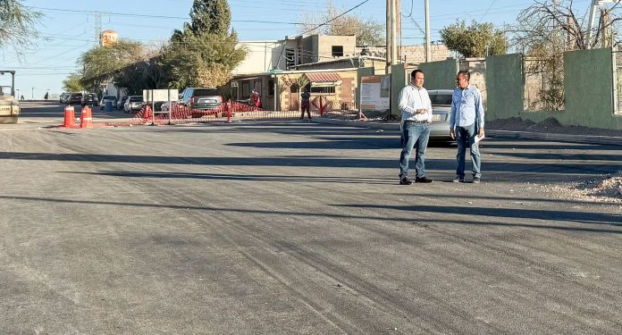 Delicias.- El presidente municipal de Delicias, Jesús Valenciano García, supervisó los avances en la rehabilitación de la red de agua potable y drenaje sanitario en la calle 2 y la avenida de Los Nogales, en la colonia Campesina. La obra, que también incluye el revestimiento asfáltico de la zona, representa una inversión de casi 5 millones de pesos.