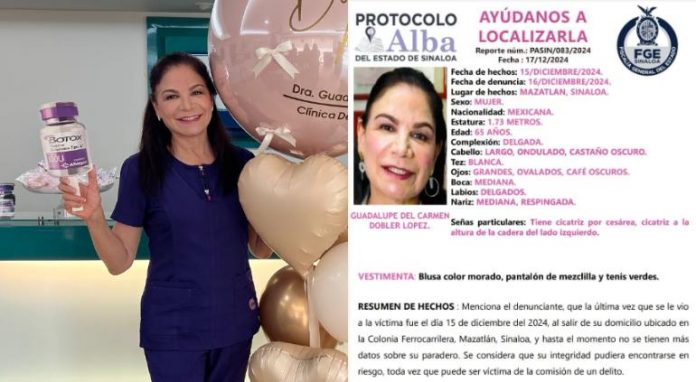 En Mazatlán desapareció la dermatóloga Guadalupe del Carmen Dobler López al salir de su casa el pasado 15 de diciembre.