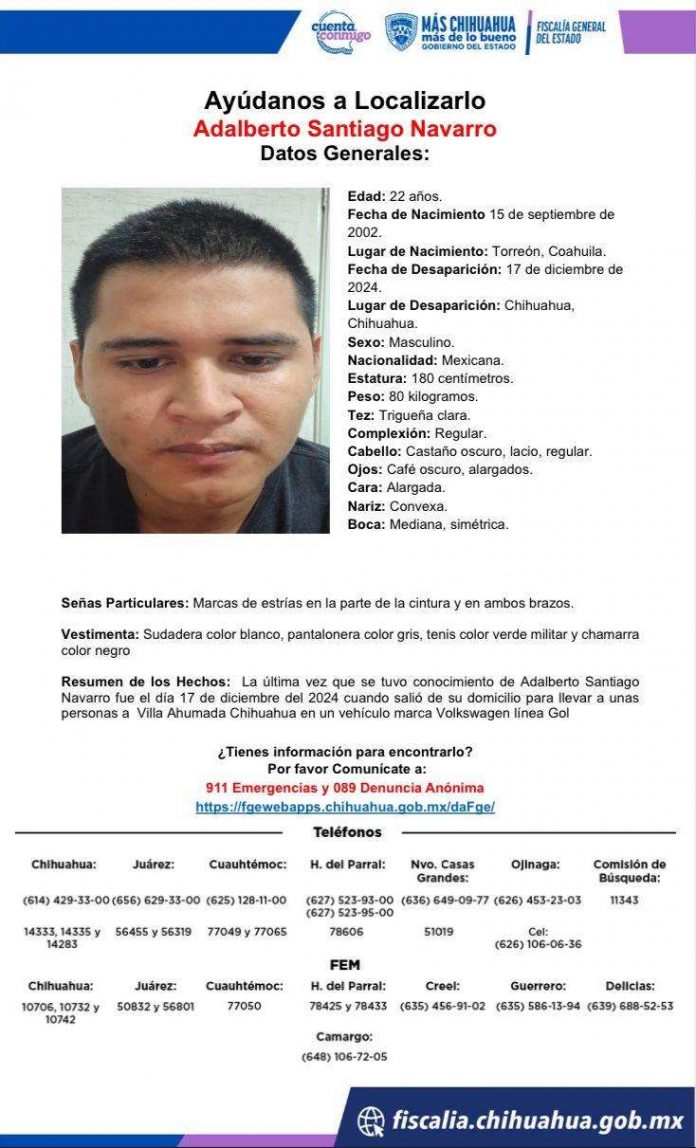 El reporte que da la fiscalía, es que Adalberto Santiago desapareció el martes pasado, cuando salió de su casa para llevar a unas personas a Villa Ahumada, en un auto Volkswagen, línea Gol.