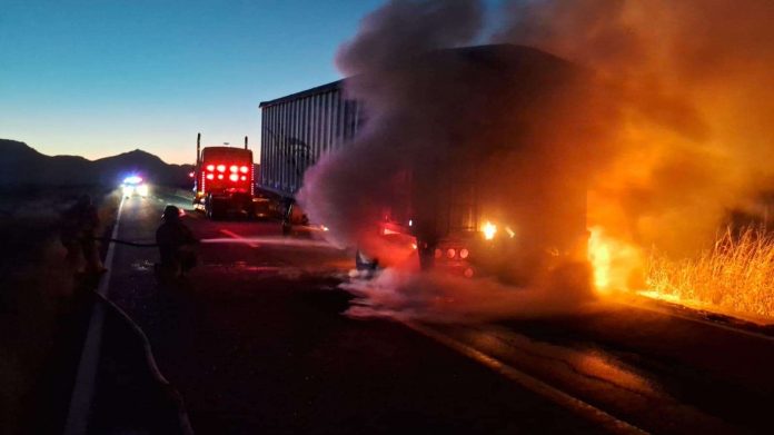 Chihuahua.- Un incendio consumió la caja de un tráiler que circulaba por la carretera Buenaventura a Flores Magón.
