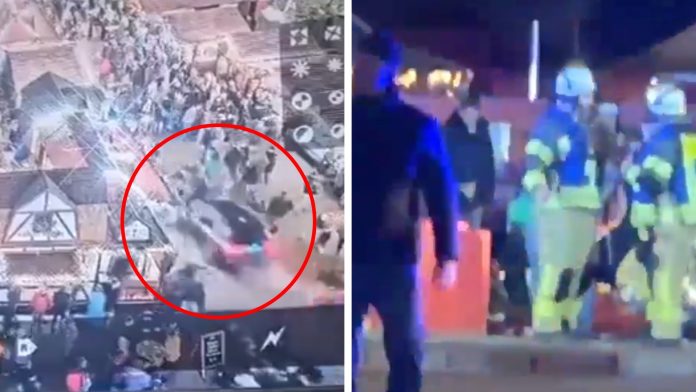Imágenes de redes sociales, verificadas por CNN, muestran el momento en que un automóvil negro se lanzó directamente contra la multitud en el concurrido mercado navideño.