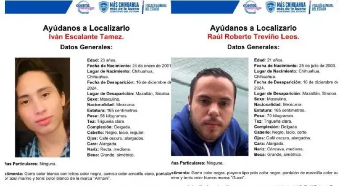 Chihuahua.- Los jóvenes Iván Alejandro Escalante Támez, de 23 años, y Raúl Roberto Treviño Leos, de 21, continúan desaparecidos, cumpliendo hoy una semana desde su última aparición el pasado lunes 16 de diciembre de 2024.