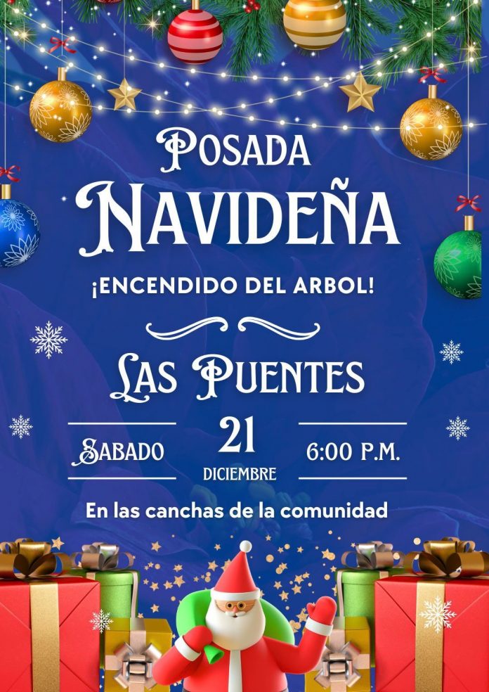 El próximo sábado 21 de diciembre, la comunidad de Las Puentes será el escenario de una celebración navideña organizada por el Gobierno Municipal de Meoqui, a partir de las 6:00 de la tarde, extendiendo la invitación a las familias de la Cordillera y sus alrededores, quienes podrán disfrutar de una posada y del tradicional encendido del árbol navideño en las canchas de la comunidad.