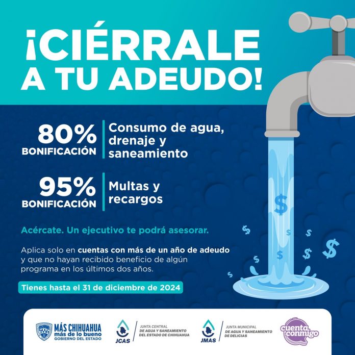 El titular de la Junta Municipal de Agua y Saneamiento de Delicias, Juan Carlos Velasco Ponce, precisó que este programa aplica en cuentas con más de un año de adeudo, y que no hayan aplicado para alguno otro por el mismo motivo.