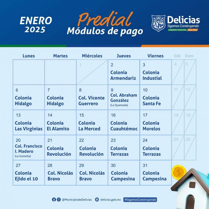 Delicias.- El Gobierno Municipal de Delicias informó que durante el mes de enero, el módulo móvil para el pago del impuesto predial recorrerá 17 colonias rurales, acercando este servicio a las comunidades para facilitar el cumplimiento de esta obligación fiscal.