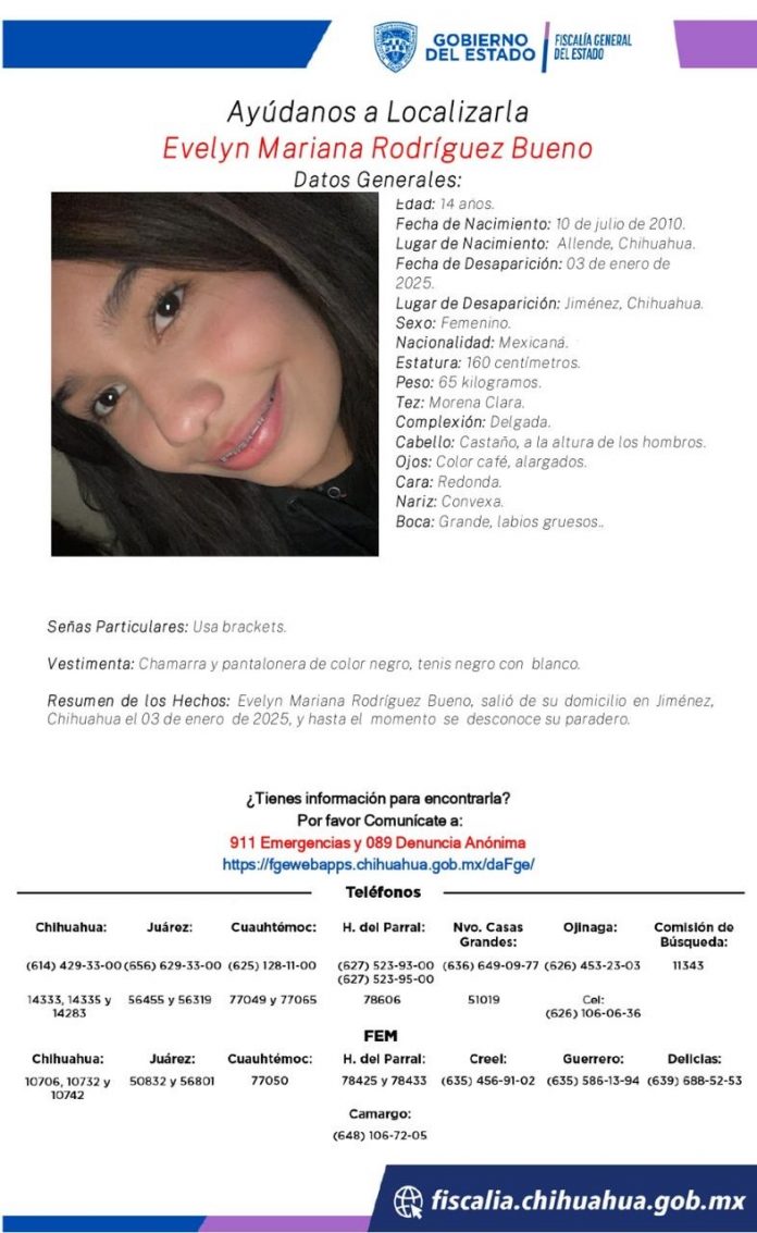 Jiménez.- La familia y las autoridades solicitan la ayuda de la comunidad para localizar a Evelyn Mariana Rodríguez Bueno, una adolescente de 14 años que desapareció el pasado 3 de enero de 2025 en Jiménez, Chihuahua.