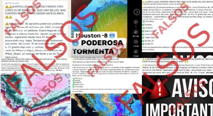 La información falsa dice que a partir del lunes 20 de enero ingresará un “poderoso y extremo frente frío” y que sería “uno de los más fuertes registrados en 52 años”, que se sentirá en Chihuahua, el sur de Texas y otros estados como Durango, Coahuila, Nuevo León y Tamaulipas.