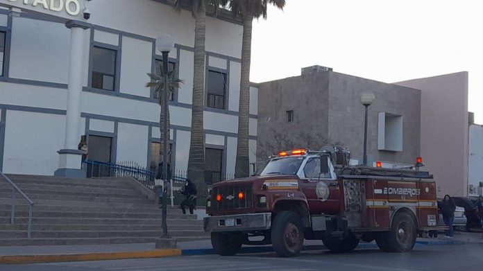 Chihuahua.- Elementos del H. Cuerpo de Bomberos acudieron a la Fiscalía General del Estado tras un reporte de un fuerte olor a gas en las instalaciones.