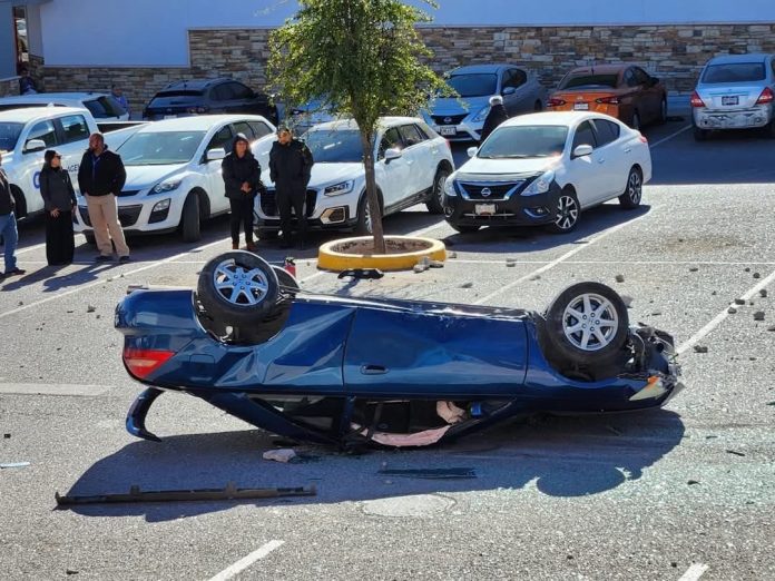 Según testigos, una conductora que circulaba a exceso de velocidad en dirección norte-sur perdió el control de su vehículo en una curva y salió proyectado, chocando contra un muro de contención y volcando con las llantas hacia arriba en el estacionamiento del centro comercial.