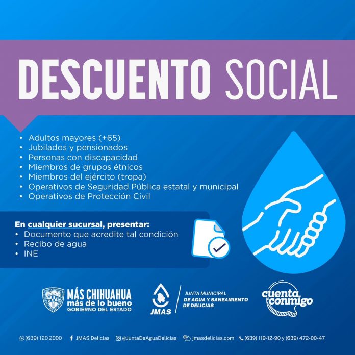 Delicias.- La Junta Municipal de Agua y Saneamiento (JMAS) de Delicias informó que los usuarios que se encuentran en determinadas categorías pueden acceder a un descuento especial en el pago de su servicio de agua.