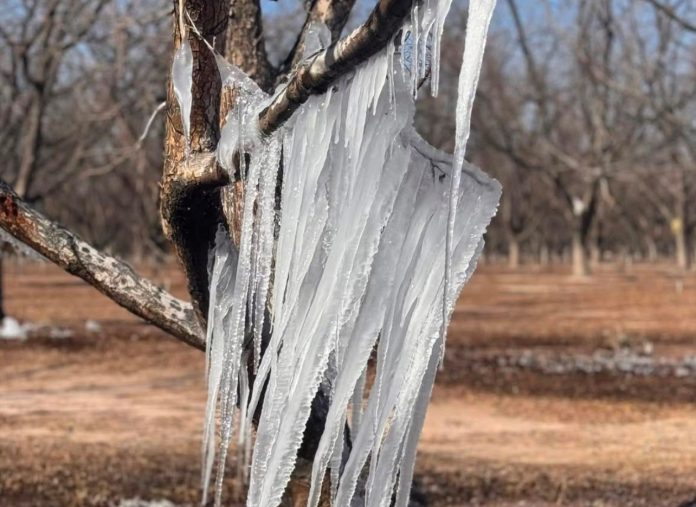 Camargo.- En un rancho de San Francisco de Conchos, el agricultor Rafael Rodríguez Silva capturó un fenómeno natural impresionante: grandes estructuras de hielo en forma de carámbanos cuelgan de las ramas de los árboles, mientras que otras se forman en el suelo sobre la hierba quemada por el frío.