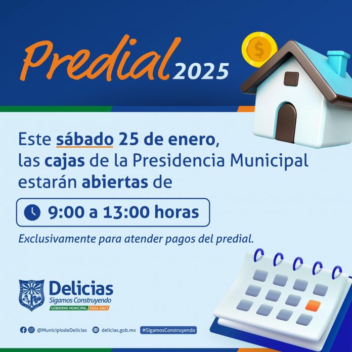 Delicias.- Este sábado, la Presidencia Municipal de Delicias abrirá sus cajas de 9:00 a 13:00 horas exclusivamente para recibir pagos del impuesto predial 2025.