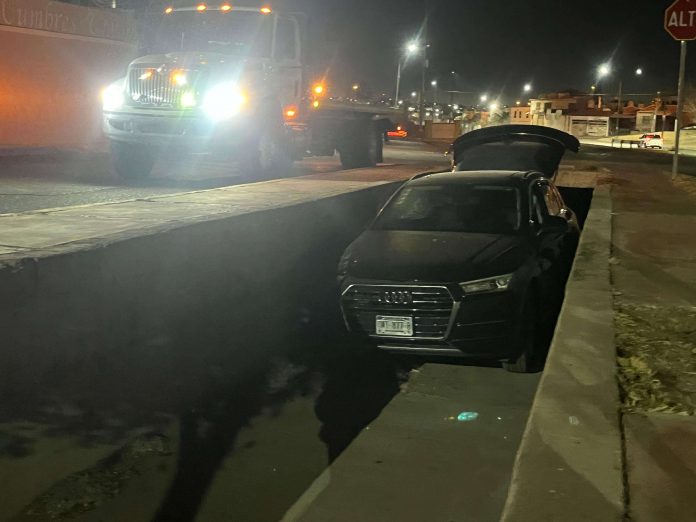 Chihuahua.- Un vehículo Audi Q5 color negro terminó al interior de una canaleta después de que la conductora perdiera el control del volante tras sentirse mal.
