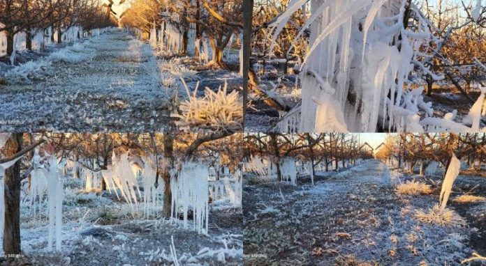 El fenómeno climático, impulsado por una intensa masa de aire polar, ha causado que los cultivos de manzana en Guerrero, una de las principales zonas productoras del estado, se cubran con una gruesa capa de escarcha y carámbanos. Este escenario refleja el impacto de las bajas temperaturas en la agricultura local, donde se teme que las heladas puedan afectar la próxima cosecha.