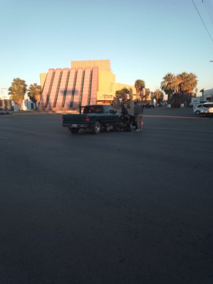 Delicias.- Esta mañana, un motociclista resultó herido tras ser embestido por una pick up frente al Teatro de la Ciudad. El impacto fue tan fuerte que la motocicleta quedó debajo de la pick up.
