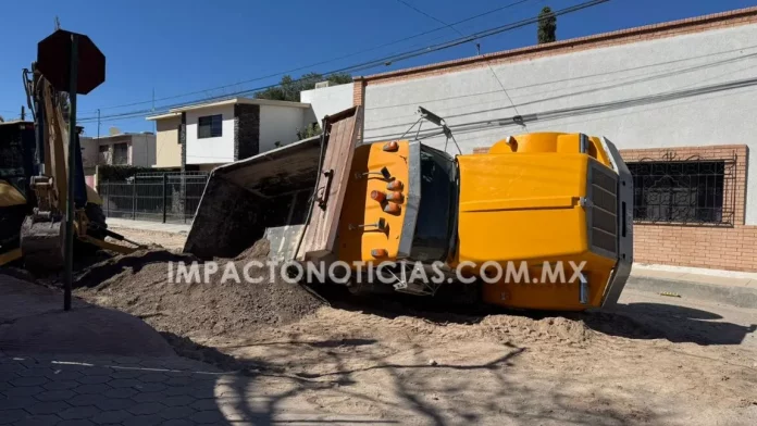 Camargo.- Un dompe de la empresa Salgado sufrió de una volcadura la tarde de este marres en calle Allende cruce con Manuel Doblado.