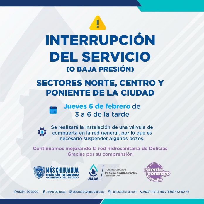 Delicias.- La Junta Municipal de Agua y Saneamiento (JMAS) de Delicias anunció que se llevará a cabo una interrupción del servicio de agua potable en los sectores norte, centro y poniente de la ciudad.