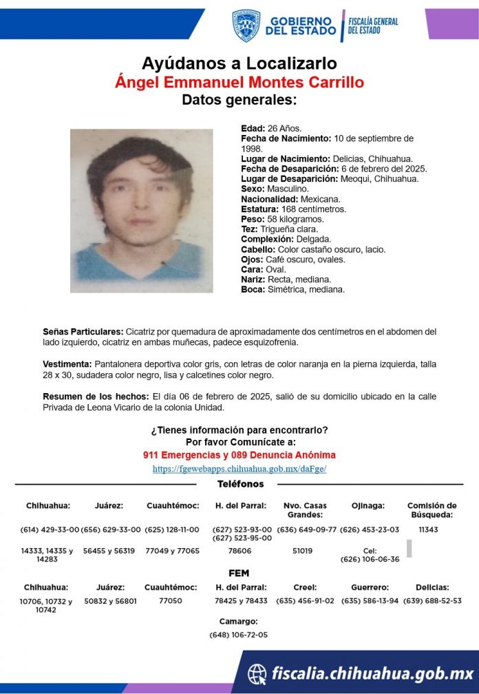 Meoqui.- La familia de Ángel Emmanuel Montes Carrillo, de 26 años de edad, solicita la ayuda de la comunidad para localizarlo después de su desaparición en Meoqui, Chihuahua.