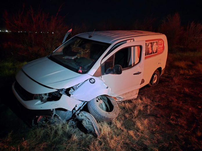 Meoqui.- Un accidente de tráfico ocurrió en la carretera federal, a la altura del entronque a la comunidad de San Lucas, en el municipio de Meoqui, donde una camioneta de reparto de carne impactó contra el muro de contención que divide los sentidos de la carretera.