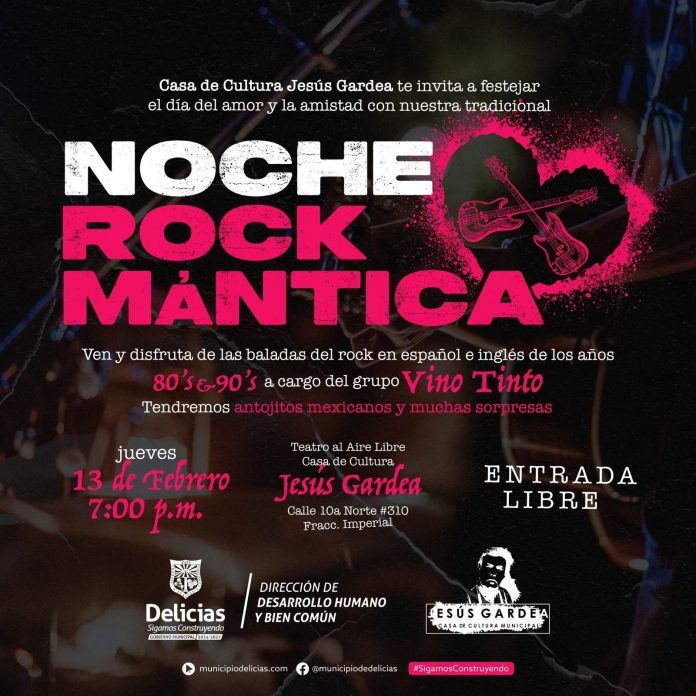 Delicias.- La Casa de Cultura Jesús Gardea invita a celebrar el Día del Amor y la Amistad con un evento lleno de música, sorpresas y buen ambiente en la “Noche Rockmántica”, que se llevará a cabo este jueves 13 de febrero a las 7:00 p.m. en el Teatro al Aire Libre de la Casa de Cultura.