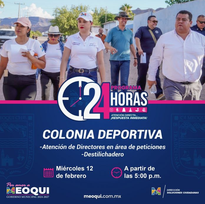 Meoqui.- El “Programa 24 Horas”, con atención directa hasta los hogares meoquenses, estará presente este miércoles 12 de febrero en la Colonia Deportiva, donde el equipo del Gobierno de Meoqui atenderá las peticiones de las familias meoquenses en un horario de 5:00 p.m. a 6:30 p.m., teniendo como punto de referencia la intersección de las calles 2 de Abril y Pascual Orozco.