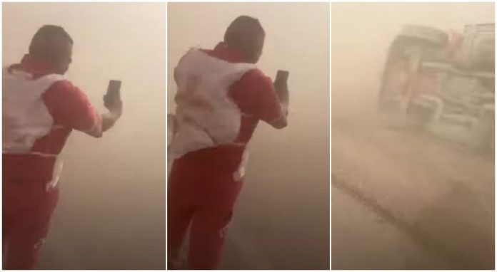 En la grabación el sonido del viento es prácticamente ensordecedor, mientras que la arena que se levanta impide ver más allá de pocos metros de distancia.
