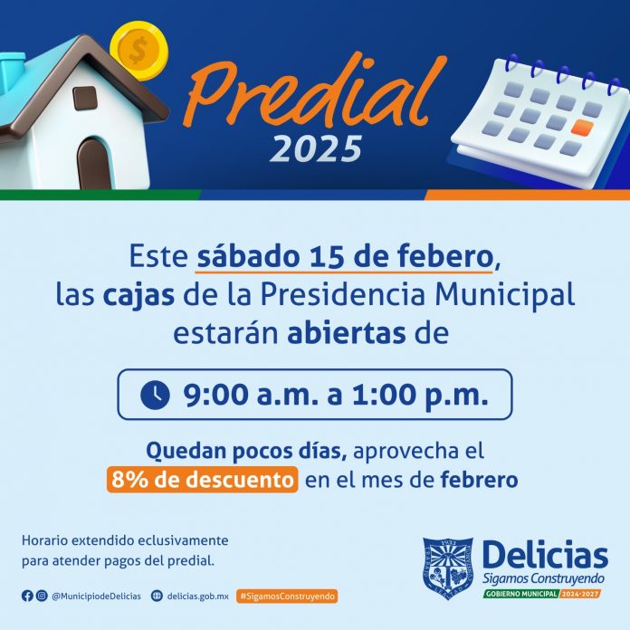 Delicias.- El Gobierno Municipal de Delicias informó que este sábado 15 de febrero, las cajas de la Presidencia Municipal estarán abiertas en un horario especial de 9 de la mañana a 1 de la tarde con el fin de facilitar el pago del Impuesto Predial 2025 y permitir que más ciudadanos aprovechen el descuento del 8% vigente durante febrero.