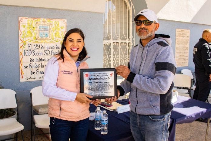 Meoqui.- Durante la jornada del programa “Miércoles con tu Alcaldesa”, la Arquitecta Miriam Soto, recibió un reconocimiento por parte de los padres de familia y alumnos de la Academia de Basquetbol Vikingos, a quienes ha apoyado e impulsado desde su fundación en el año 2021.
