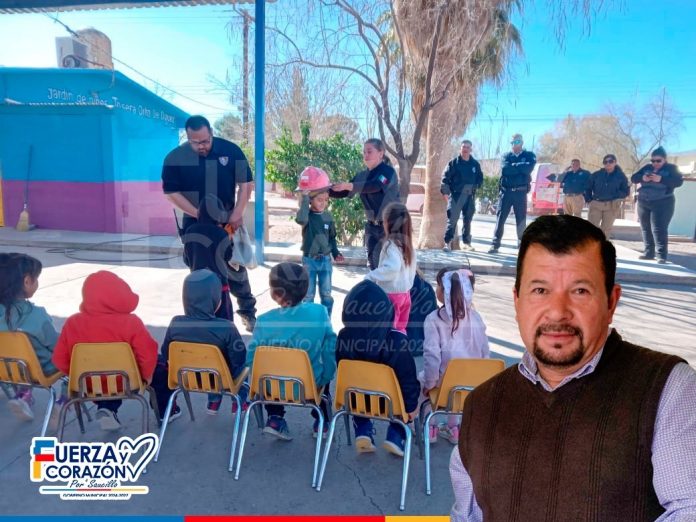 Saucillo.- Con el objetivo de fortalecer la confianza entre la niñez y los cuerpos de seguridad, el presidente municipal Fito Gardea, a través del departamento de Prevención Delictiva de la Dirección de Seguridad Pública, llevó el programa “Policía Amigo” al Jardín de Niños Josefa Ortiz de Domínguez en la comunidad de Altamirano.