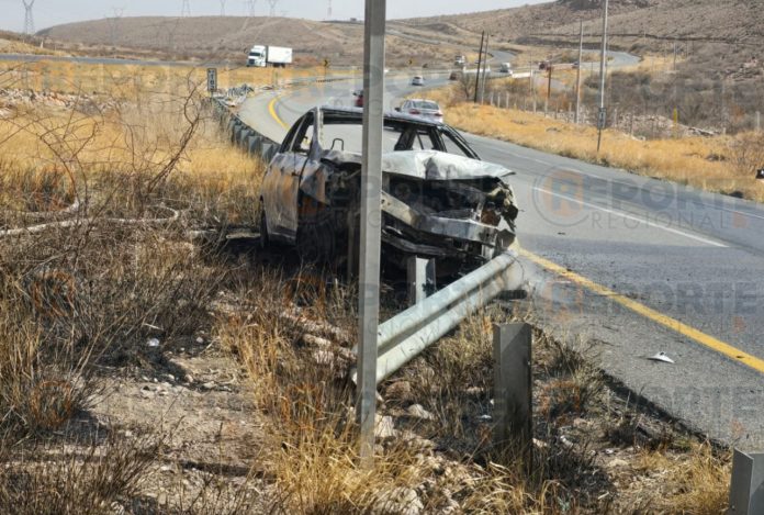 Delicias.- Un incidente de tráfico ocurrió la mañana de este sábado en la carretera federal número 45, a la altura del kilómetro 183, en el tramo entre Delicias y Chihuahua. Un vehículo Chevrolet Aveo modelo 2022 quedó completamente calcinado después de chocar contra la valla metálica de contención y incendiarse.