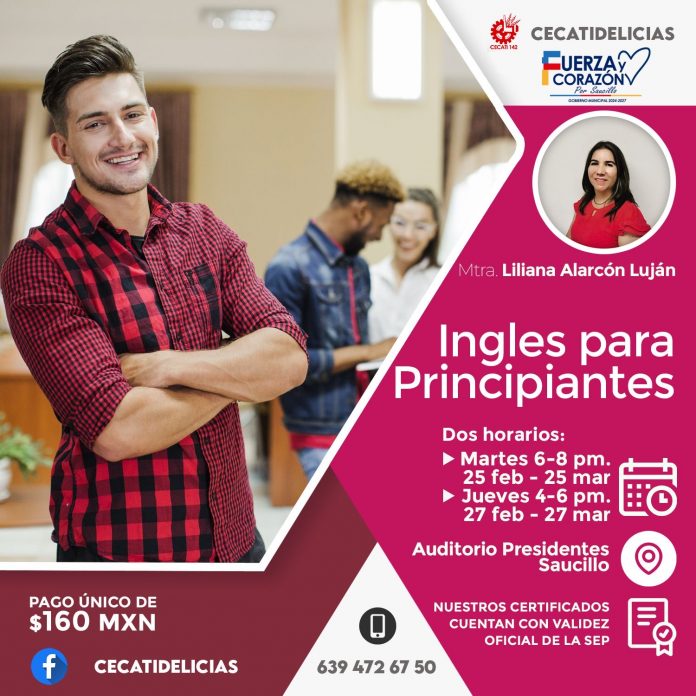 En un esfuerzo por brindar más y mejores oportunidades tanto laborales como de superación personal para los habitantes de Saucillo, el presidente municipal Fito Gardea, invita a la comunidad a participar y tomar cursos de inglés para principiantes, los cuales son ofrecidos por la maestra Liliana Alarcón lujan a través de Cecati 142 de Delicias con un costo mínimo de recuperación de $160.00 como único pago.