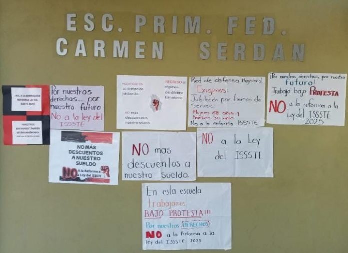 La protesta se llevó a cabo en la escuela primaria Carmen Serdán, donde los profesores se reunieron para expresar su descontento con la reforma de la ley del ISSSTE.