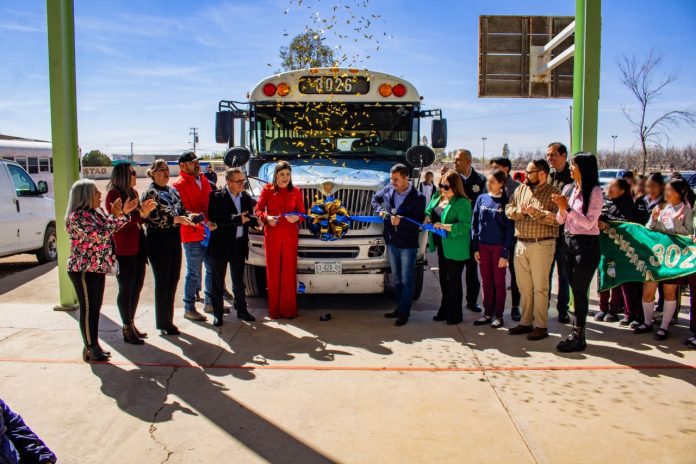 Meoqui.- La alcaldesa de Meoqui Miriam Soto acompañó a las autoridades y estudiantes de la Secundaria Estatal 3026 en la entrega de un nuevo camión escolar, siendo el resultado de la suma de esfuerzos entre alumnos, padres de familia, docentes y directivos, quienes realizaron diversas actividades para recabar el presupuesto necesario para la adquisición del mismo.