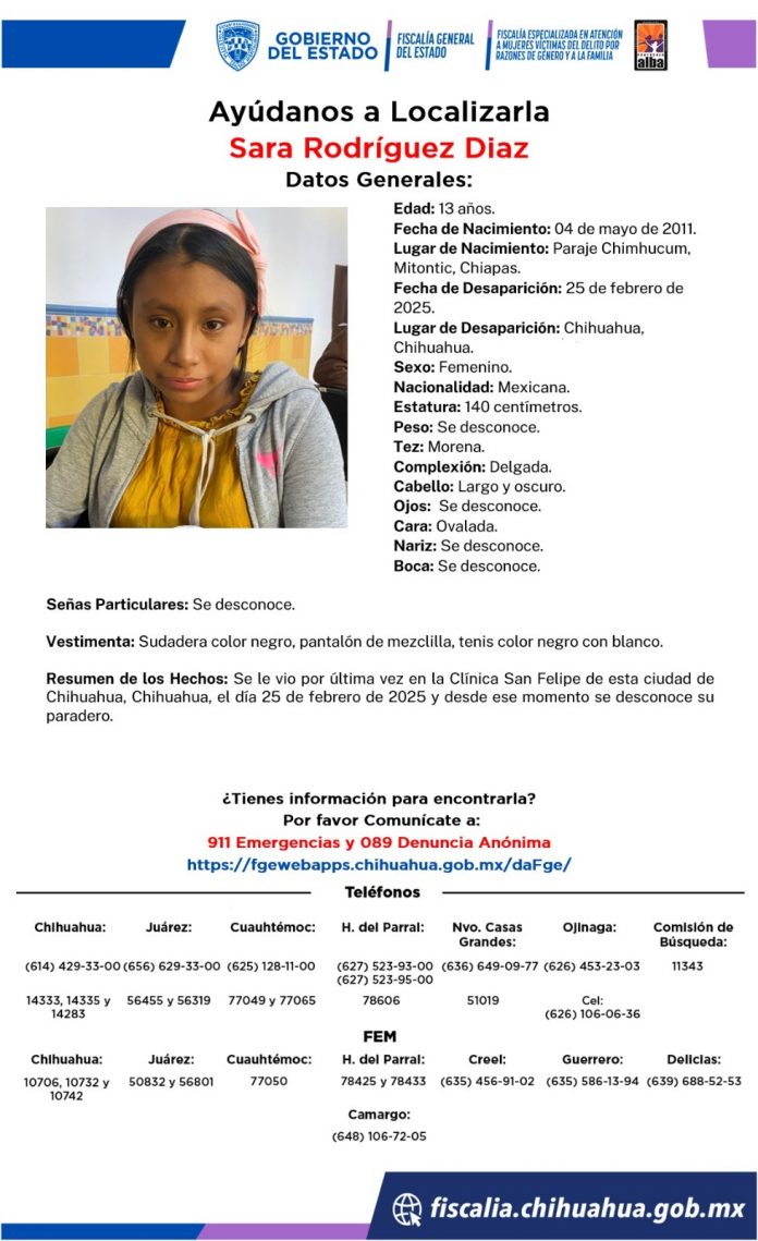 Sara Rodríguez Díaz, de 13 años, y su hija Marta Victoria Rodríguez Díaz, de solo 3 meses, fueron vistas por última vez en la Clínica San Felipe de la ciudad de Chihuahua.