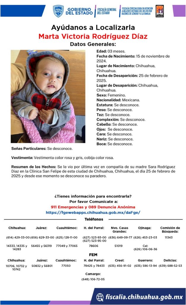 Chihuahua.- Las autoridades de Chihuahua solicitan la ayuda de la comunidad para localizar a una madre y su bebé que desaparecieron el pasado 25 de febrero.